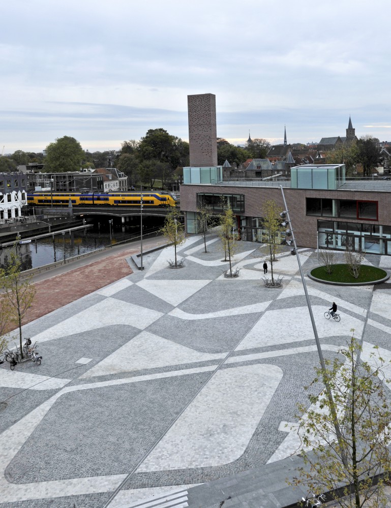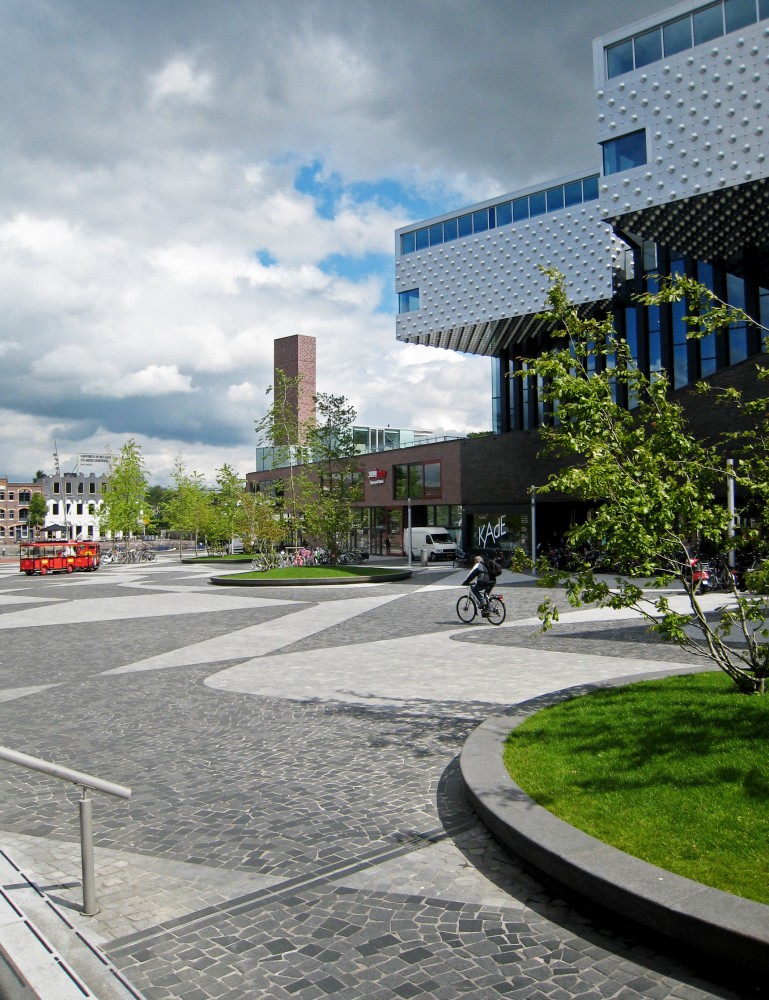 De pleinvloer is vervaardigd van lichte en donkere Portugees granietkeitjes, gestraat in wild-verband. Deze manier van bestraten kan worden toegepast door de keuze van onregelmatige steenvormen: vierkant, vijfhoekig, trapeziumvormig, etc. Deze kleine stenen zijn vervaardigd van restproducten uit de granietgroeven en zijn daarmee dubbel duurzaam. In het hellende vlak loopt in de dwarsrichting om de tien meter een lijngoot die een omkeer-effect op de bestrating teweegbrengt. Opvallende schuine verlichtingselementen, de evenementenverlichting, zijn geïntegreerd in de tribunetrap. Bescheiden masttoparmaturen zijn geplaatst in de gevelzones. Op het plein is een serie ‘graslenzen’ ontworpen met een diameter van ca 8 meter, voorzien van een zitrand rondom. In de lenzen zijn Parottia persica-bomen geplant. Door de verhoogde lensvorm is er voldoende wortelruimte bovenop de parkeergarage gecreëerd voor de Parottia’s. Buiten de contouren van de parkeergarage zijn Acer saccharinums in de volle grond geplant.